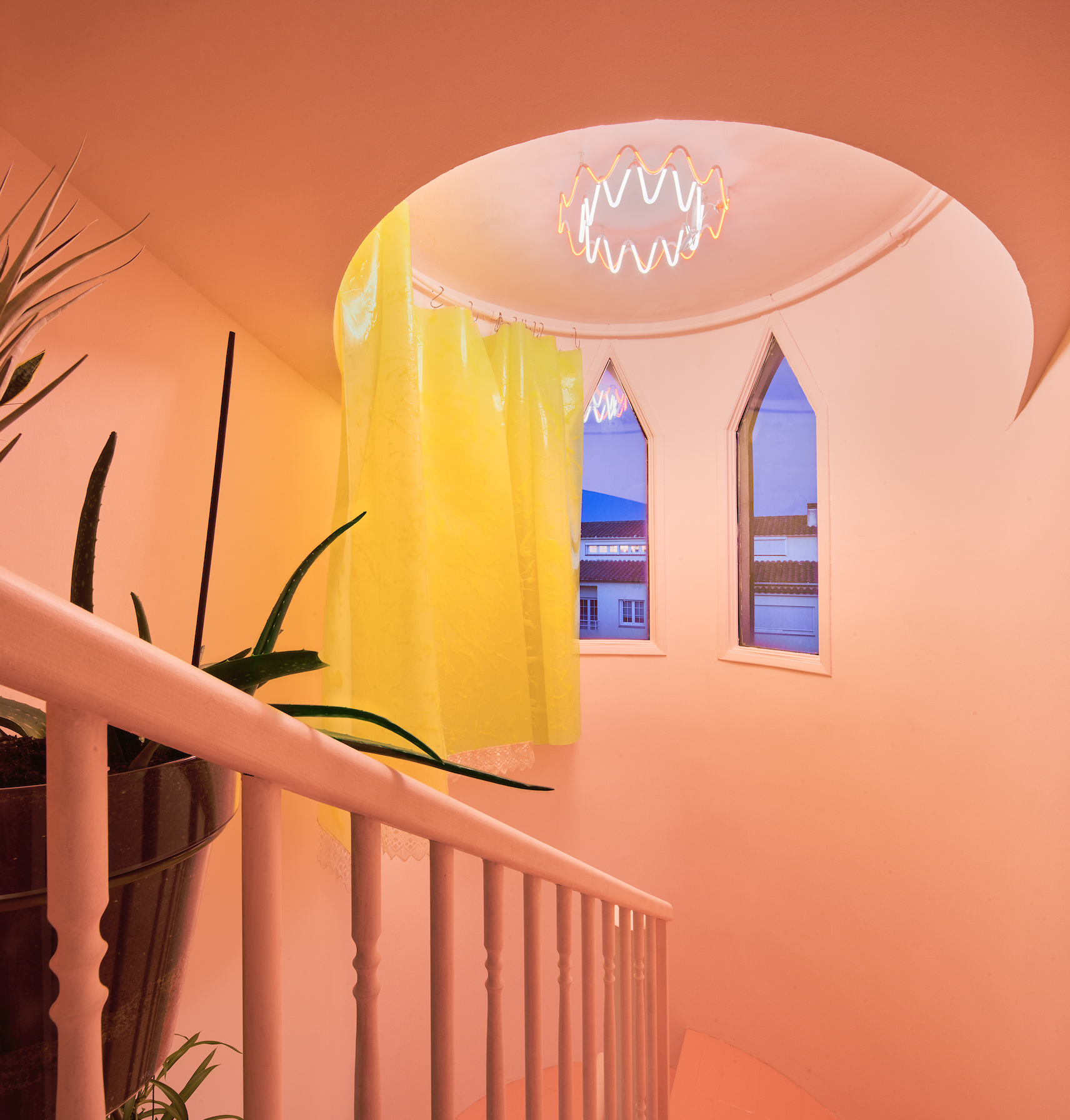 Esta mirada desprejuiciada me hizo acordar algo que mencionaste al principio acerca de abandonar dicotomías no escogidas, o que alguien más escogió para nosotros y nosotras mientras estábamos distraídos para decirlo inocentemente. Pensaba en esto que decías recién de la Real State Boom House sobre aquellos elementos singulares o característicos que se deciden señalar o incluso exagerar a partir de ciertos procedimientos, en general a partir de su construcción tecnológica o técnica. Por ejemplo, pienso en el candelabro de neón o en la cortina que rodea la escalera y que vos describiste con un peeling de la escalera anterior, en una especie de procedimiento químico que se le hace a la estructura original. Para mi hay una exageración de esas características más propias de ese interior y me preguntaba si en esa celebración de eso que otro podría considerar horrendo o cercano a la estética de lo feo, y muy lejano a esta operación de planchar un interior eliminado cualquier rastro de su lenguaje operación. ¿Cómo describirías eso con relación a tu práctica? ¿Hay algo de lo queer aplicado a un proceso de arquitectura o diseño en general que está en juego?